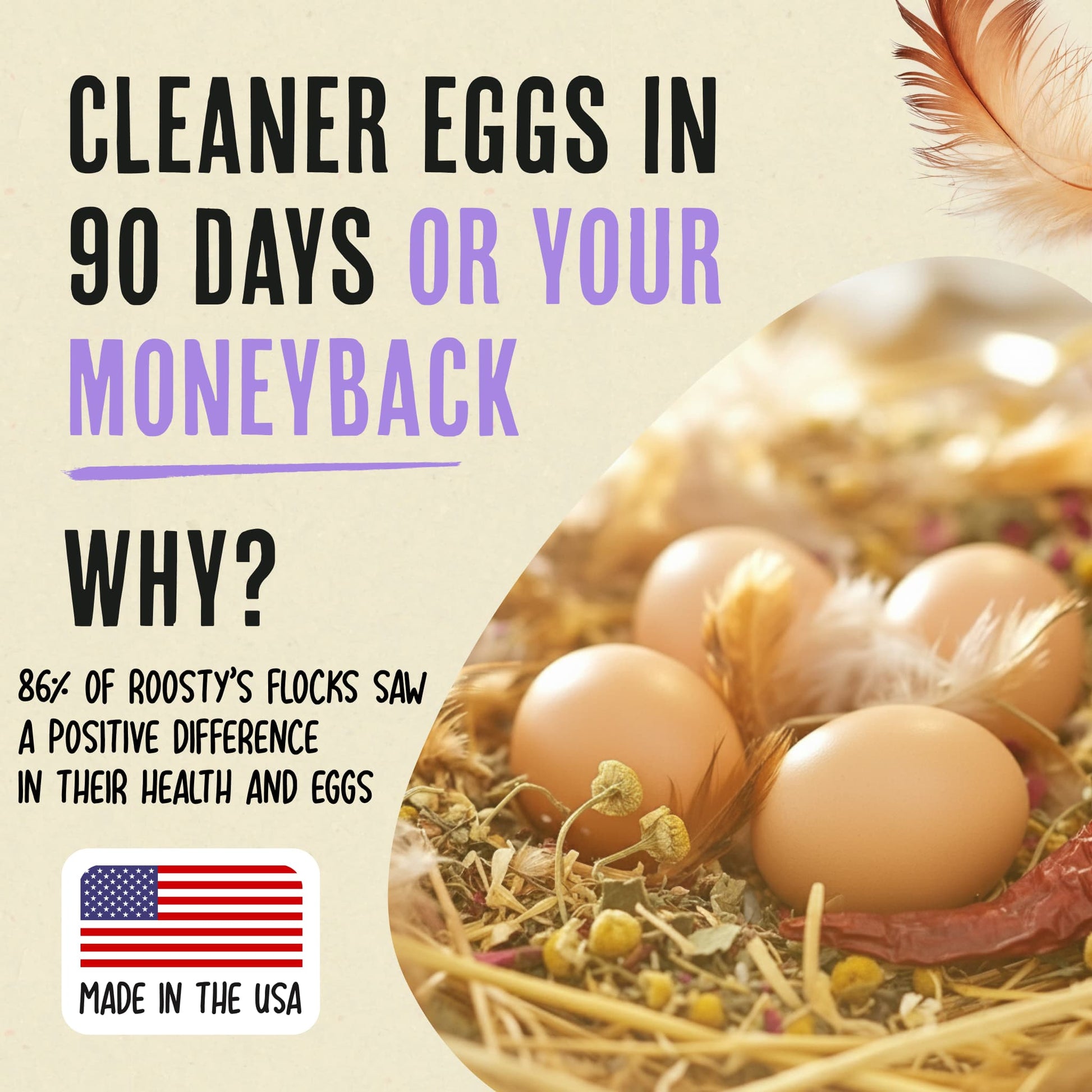 Keeping your flock healthy starts with a clean, stress-free environment. Roosty’s Nesting Herbs are the natural way to support your hens’ well-being - from cleaner coops and calmer nesting boxes to stronger immune systems and happier feet.