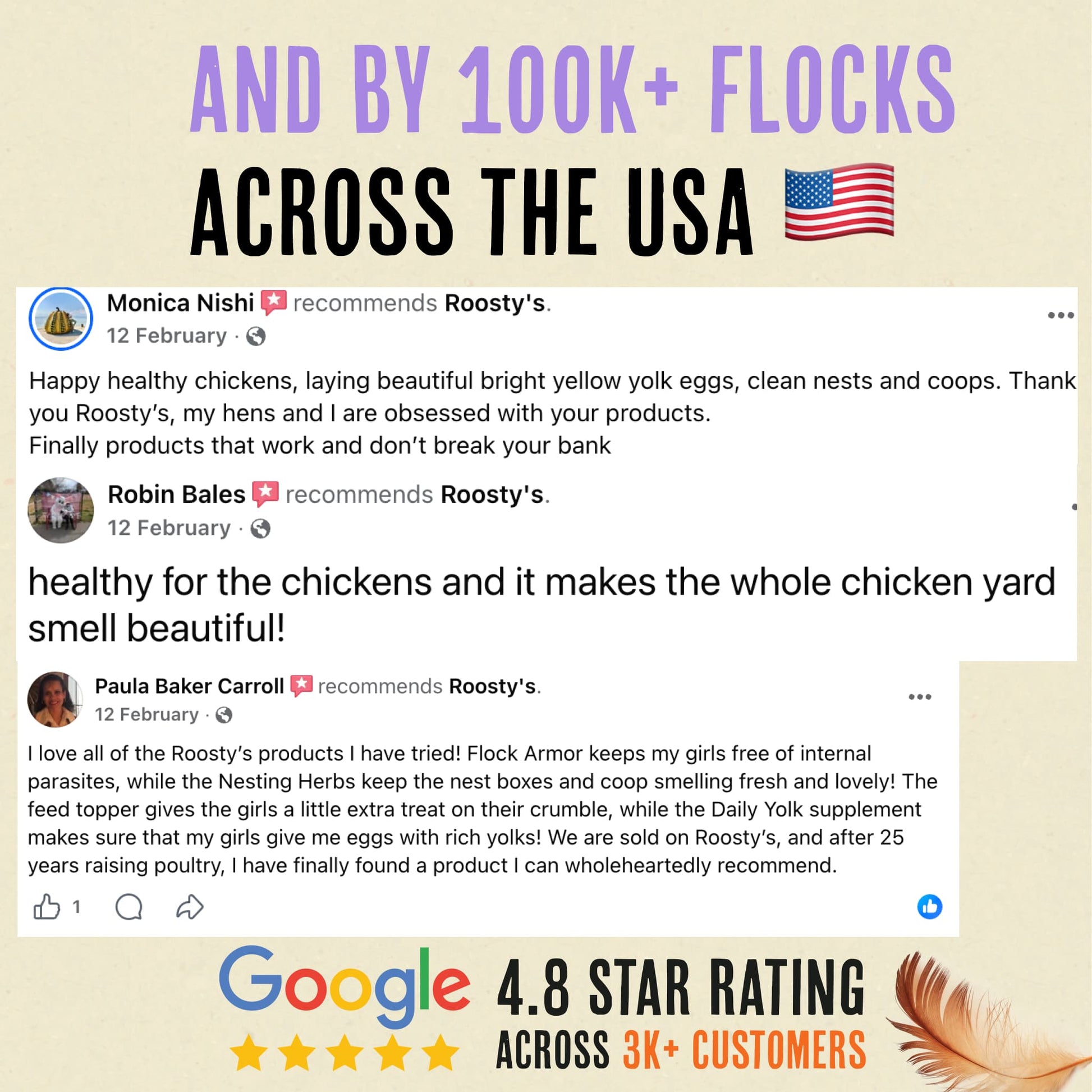 "Roosty’s is a great way to protect your girls before problems start—prevention is always better than treatment! And it leaves the coop smelling fresh and inviting."