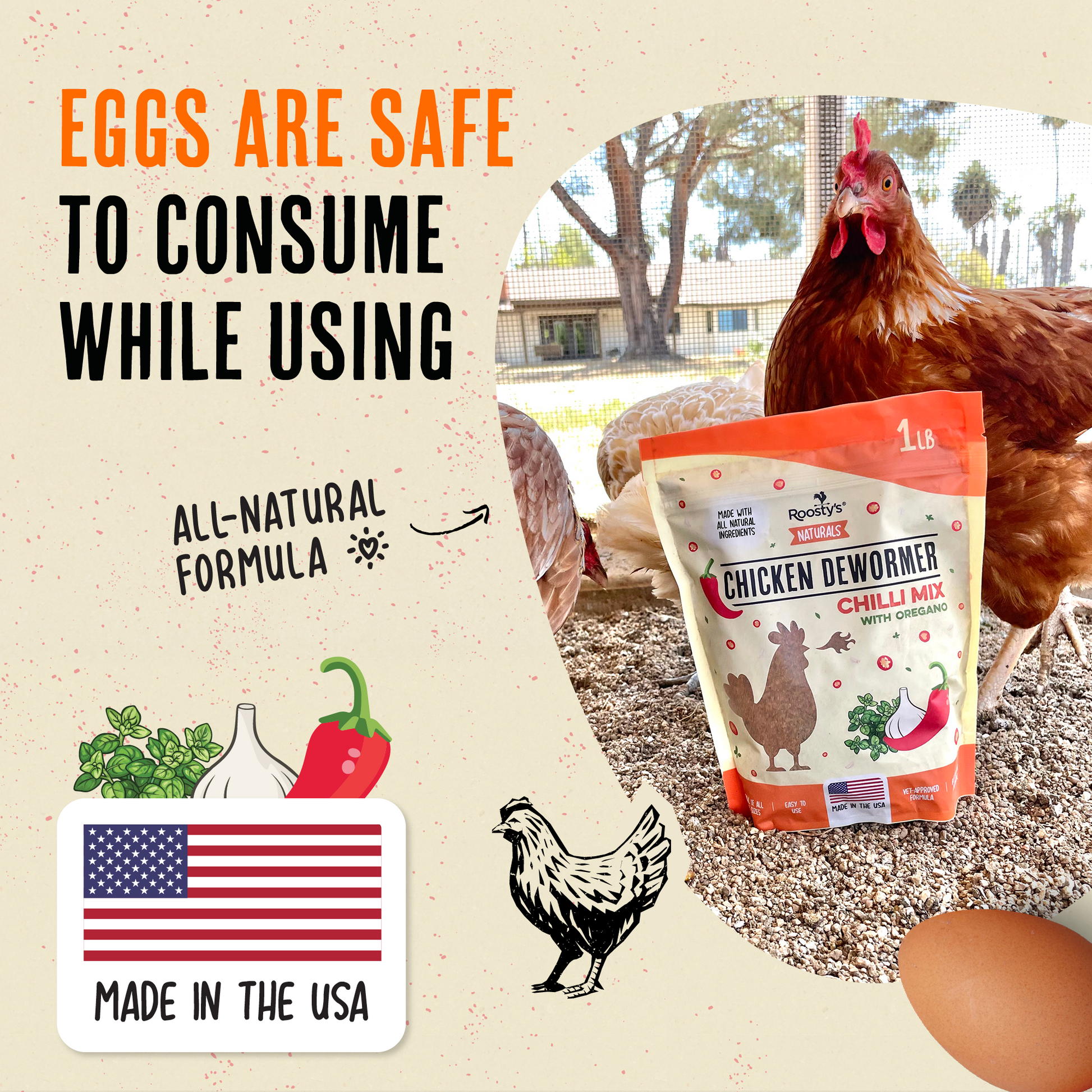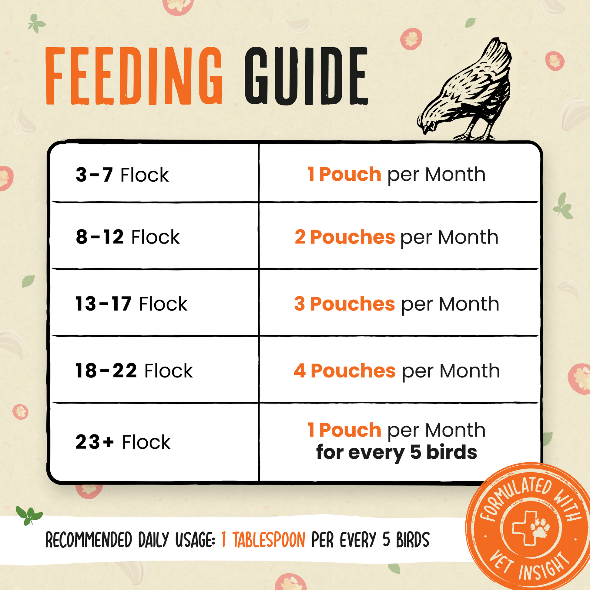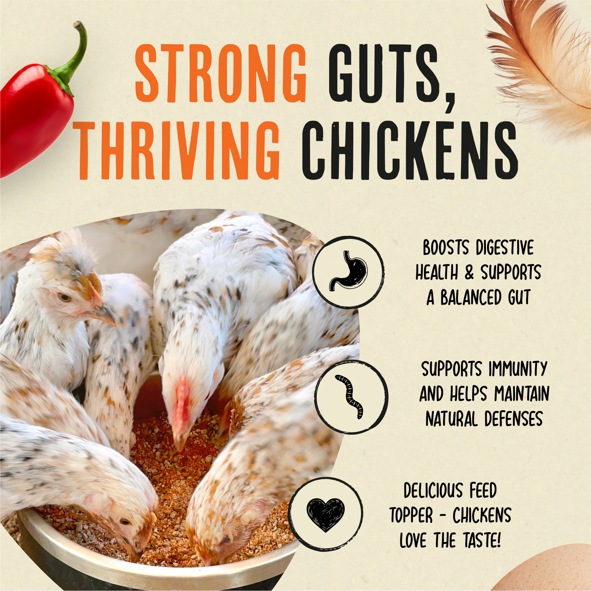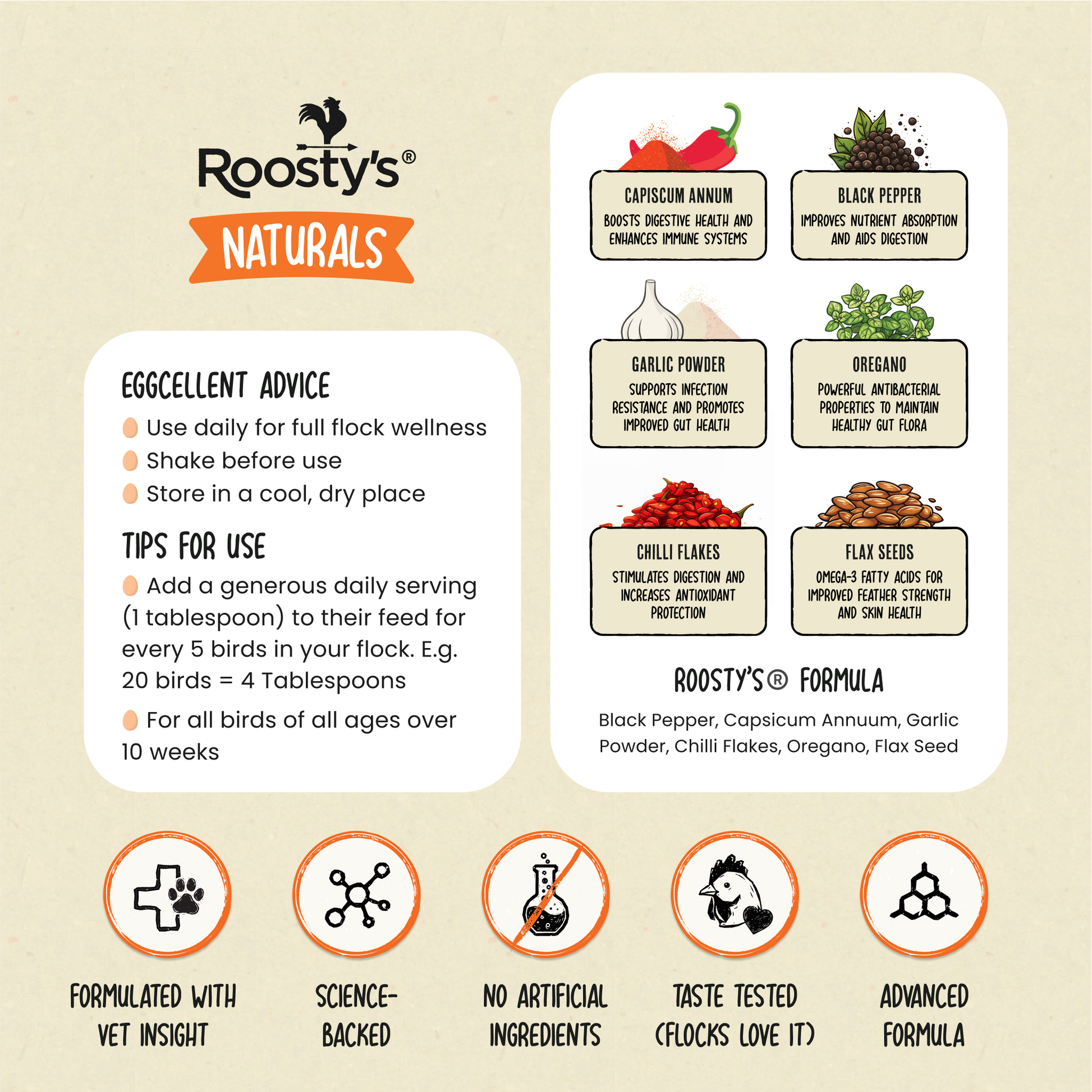 For best absorption, mix in or sprinkle directly over your chickens’ daily feed.