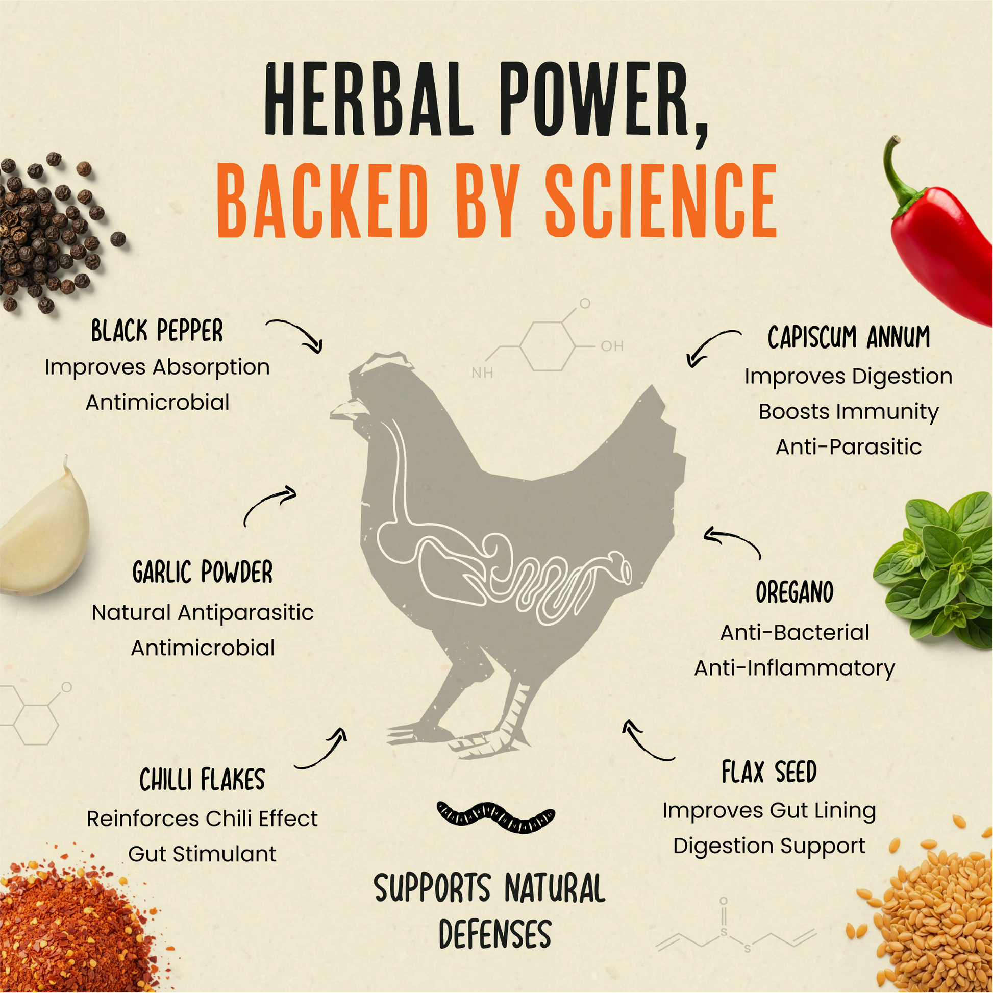Chilli flakes help stimulate appetite, support digestive health and create an unwelcoming environment for parasites.