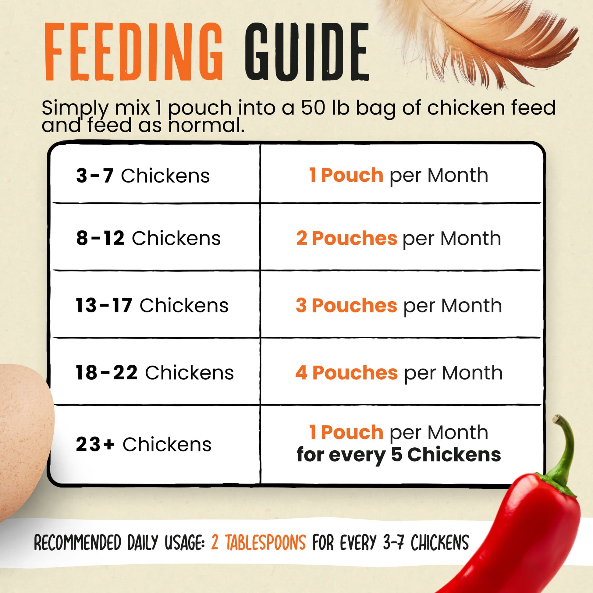 Sprinkle the mix into your chickens' feed daily, adjusting the amount based on your flock size.